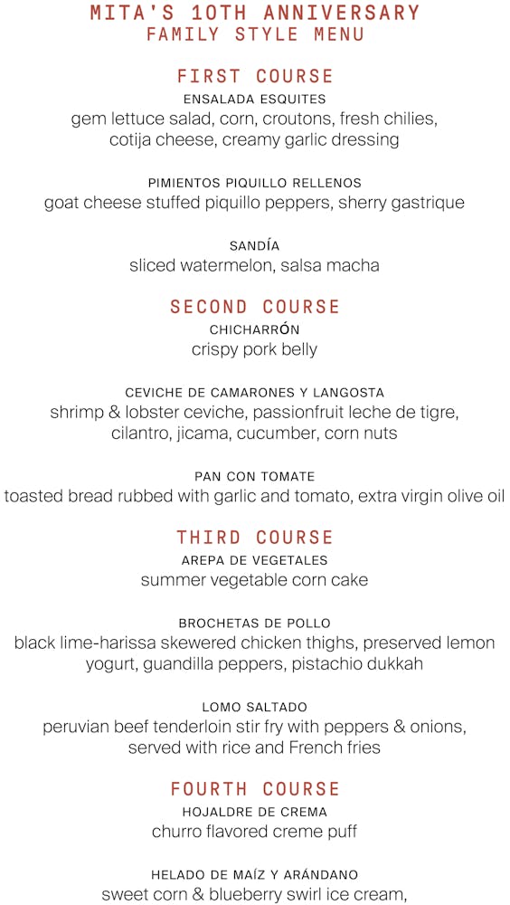 Join us in celebrating 10 years in the heart of downtown Cincinnati with an exclusive four course family style tasting menu featuring guest favorites from over the years. From a summer corn salad inspired by Mexican street corn to a Lomo Saltado inspired by the Chifa cuisine of Peru, this menu features our take on some of the most iconic Spanish and Latin American foods, and we can’t wait to share it with you.