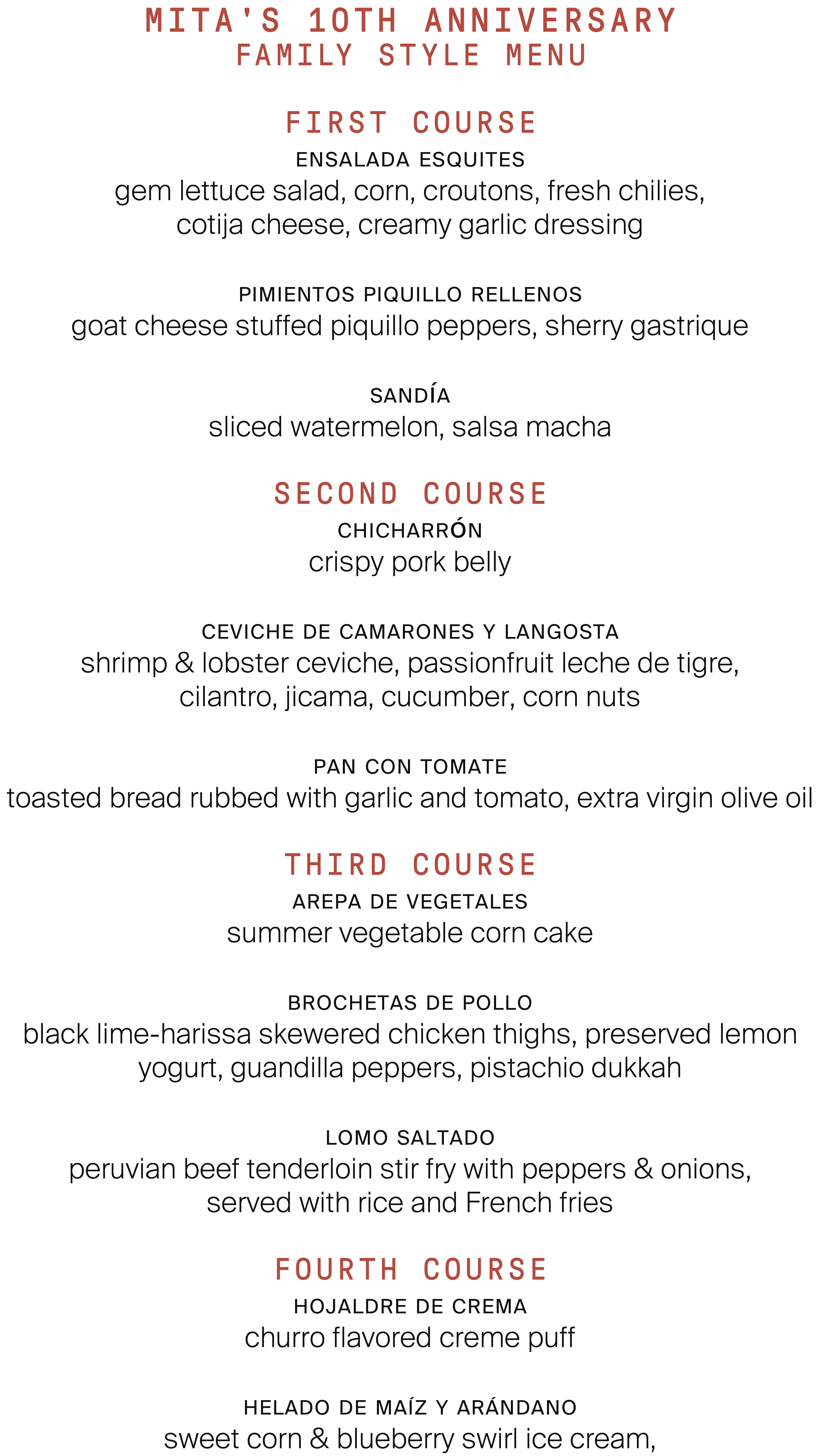 Join us in celebrating 10 years in the heart of downtown Cincinnati with an exclusive four course family style tasting menu featuring guest favorites from over the years. From a summer corn salad inspired by Mexican street corn to a Lomo Saltado inspired by the Chifa cuisine of Peru, this menu features our take on some of the most iconic Spanish and Latin American foods, and we can’t wait to share it with you.
